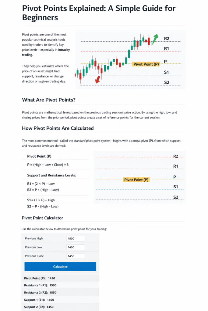 Pivot points are a simple but powerful tool that help traders determine key levels of support and resistance based on historical price data. Used correctly — and combined with other signals — they can improve your entry, exit, and risk management decisions in intraday trading.